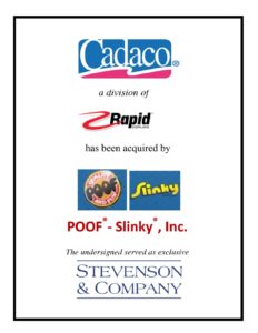 Stevenson & Company recently completed the sale of Cadaco, a division of Rapid Displays, Inc., to POOF®-Slinky®, Inc., a strategic buyer. The combination expands the company’s product line providing more diversity of products to its retail customers.